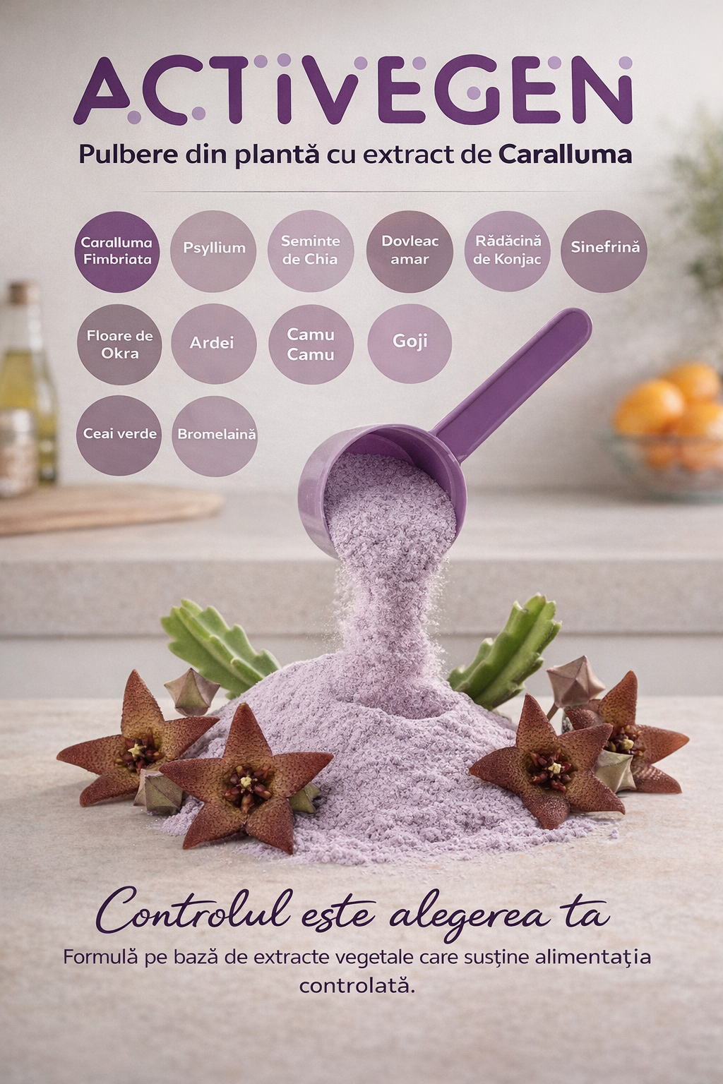 ActiveGen cu extract din Caralluma (Caralluma fimbriata) este o formulă creată pentru persoanele care vor să își gestioneze mai ușor mesele și poftele alimentare. Caralluma este cunoscută pentru utilizarea sa tradițională în susținerea reducerii senzației de foame și a controlului porțiilor, ceea ce poate ajuta în planurile de scădere în greutate.